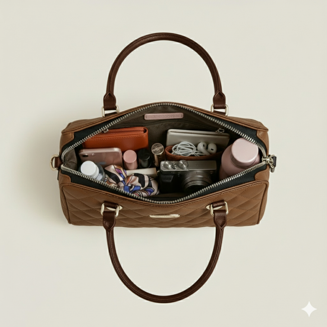 The Aurora Quilta Tote HandBag is a premium tan quilted handbag crafted for elegance, featuring golden hardware, durable handles, and versatile styling.