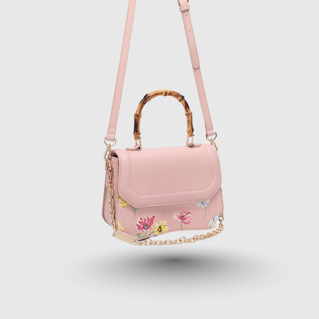 Elevate your style with this chic floral Satchel handbag. designed to add a touch of sophistication to any outfit. Crafted with high-quality faux leather, this bag features a unique bamboo-styletop handle and a removable gold chain strap for versatile carrying options—wear it as a handbag, crossbody, or shoulder bags.