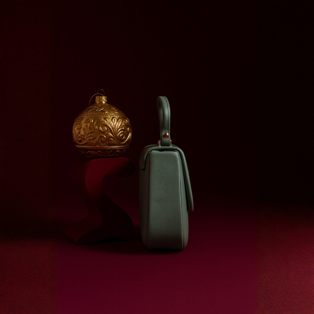 A trendy pastel green mini handbag with a premium gold round-lock closure and textured faux leather finish. Designed with a comfortable top handle and a removable sling strap, offering both functionality and style for daily outings.