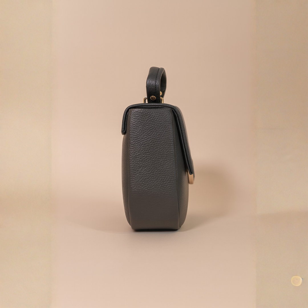 A sophisticated grey mini handbag designed with a sleek round metal lock and textured faux leather body. Its compact yet spacious compartment makes it ideal for carrying daily essentials with style.